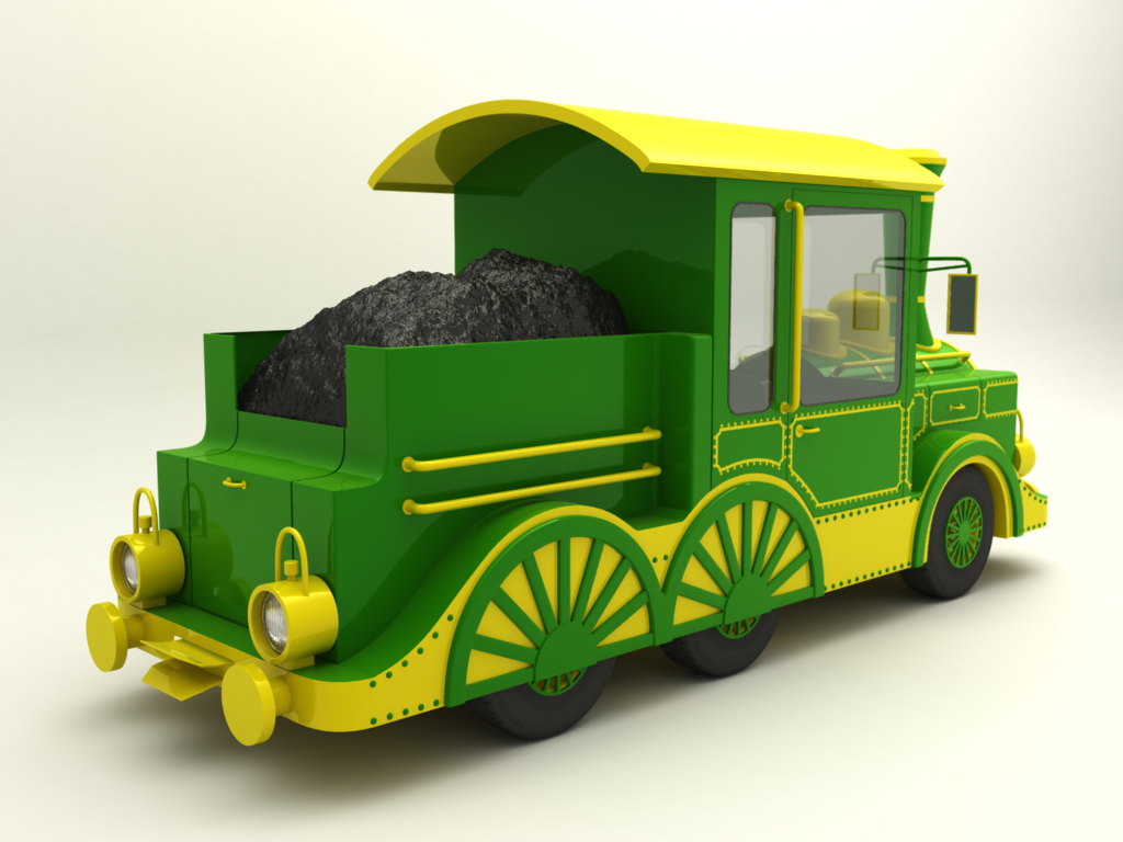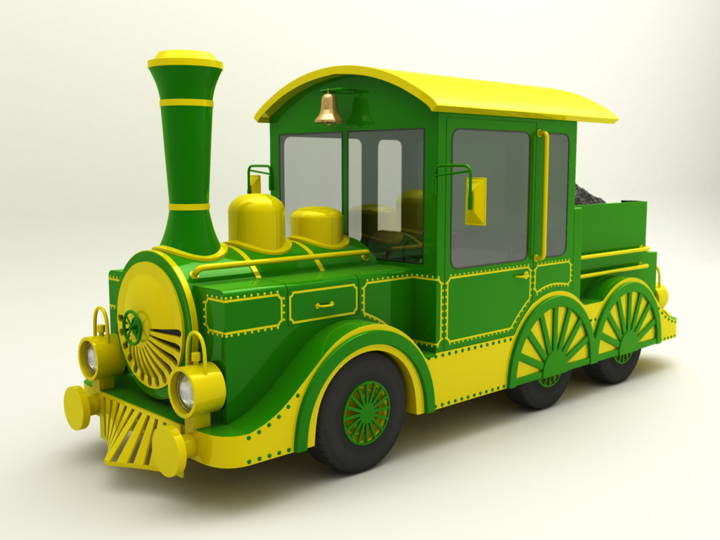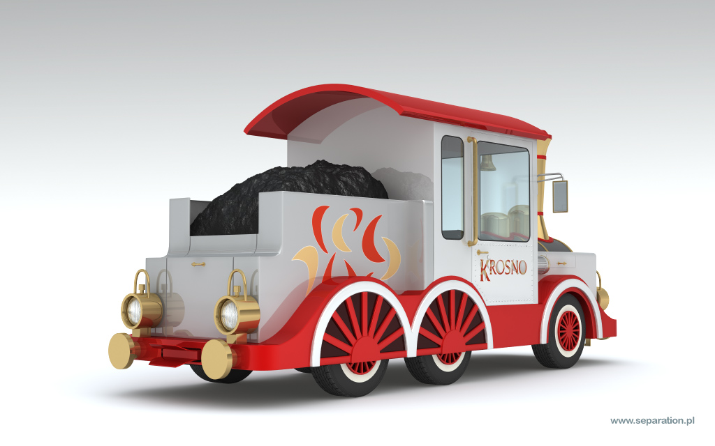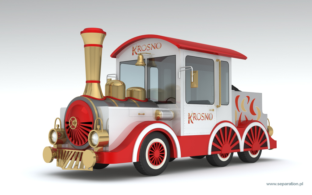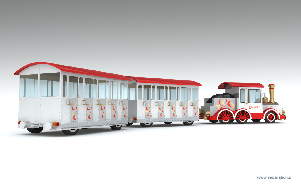 Projekt wykonałem za zlecenie producenta kolejek. Moim zadaniem było zaprojektowanie kolejki a następnie wykonanie wiuzalizacji. Modele wagonów postały na podstawie już istniejącego projektu. Przy projektowaniu "parowozu" musiałem uwzględnić wszystkie ograniczenia techniczne - projekt oparty jest na nadwoziu samochodu. W takiej sytuacji nie ma możliwości podniesienia kotła czy obniżenia szyb.